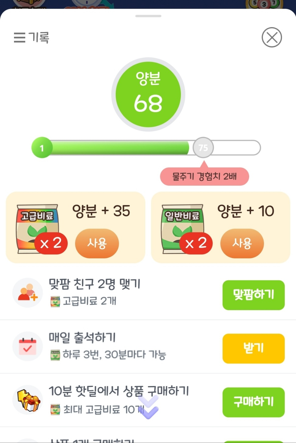 먼저 비료를 받는 방법 먼저 알려드릴게요! 비료 받기를 선택하면 아래와 같은 화면이 뜨는데요! 이 중에서 이동 중이나 남는 시간에 할만한 것은 '매일 출석하기'와 '추천 상품 60초 구경하기'입니다. 60초 구경하기는 스크롤을 내려야 시간이 줄어드니 주의하세요! 비료를 받는 다른 방법으로는 상품을 구매하는 것인데요! 인내심이 바닥을 드러낼 때 집에 필요한 상품을 올웨이즈에서 구매하는 방법입니다!