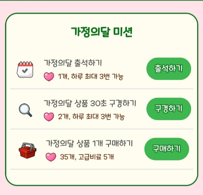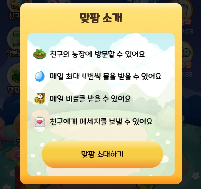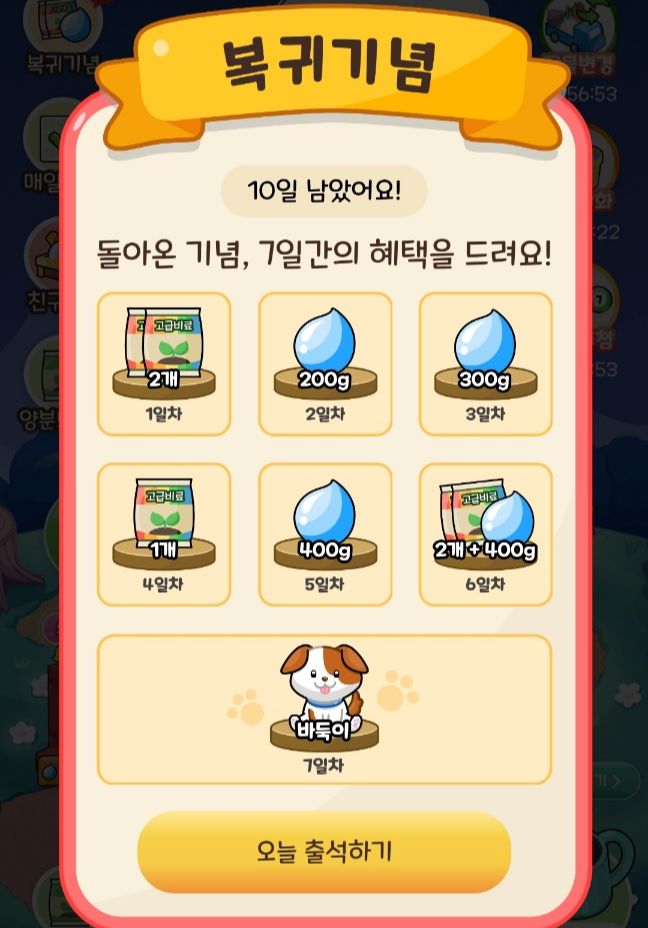 달마다 이벤트가 추가로 생기는데요! 5월에는 가정의 달이라고 하트를 나눠주는데 물이나 양분으로 교환할 수 있습니다. 이런 이벤트를 놓치지 말고 꼭 받아 가세요~! 또 오랜만에 복귀하면 복귀했다고 선물을 나눠주고 친구와 맞팜을 맺으면 좀 더 쉽게 농작물을 키울 수 있어요!